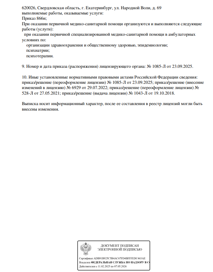 Специализируется на диагностике и лечении таких психических расстройств, как депрессия, маниакально-депрессивный психоз, панические расстройства, навязчивые состояния, страхи, фобии, шизофрения, неконтролируемая агрессия, булимия и анорексия, апатия и вялость.