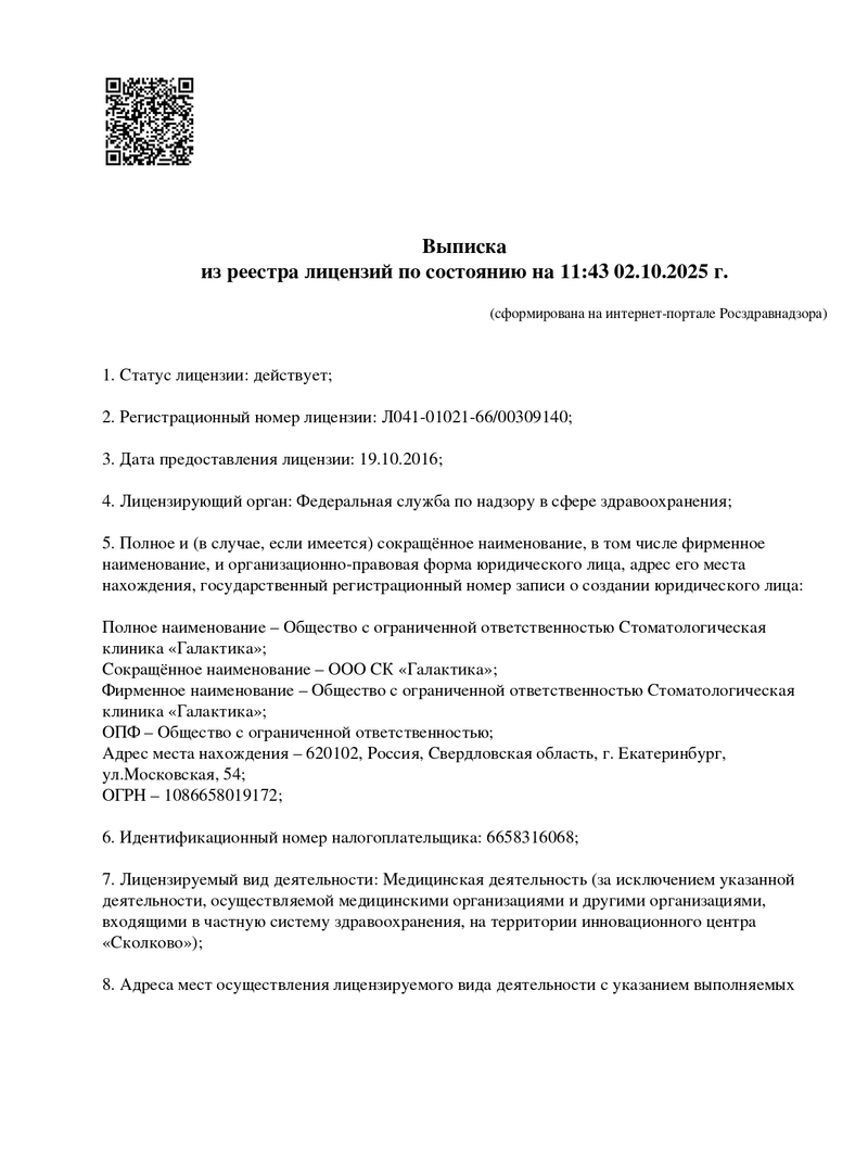 Диапазоны цен на приём врачей и специалистов, услуги и диагностику в Стоматология Галактика в Екатеринбурге.